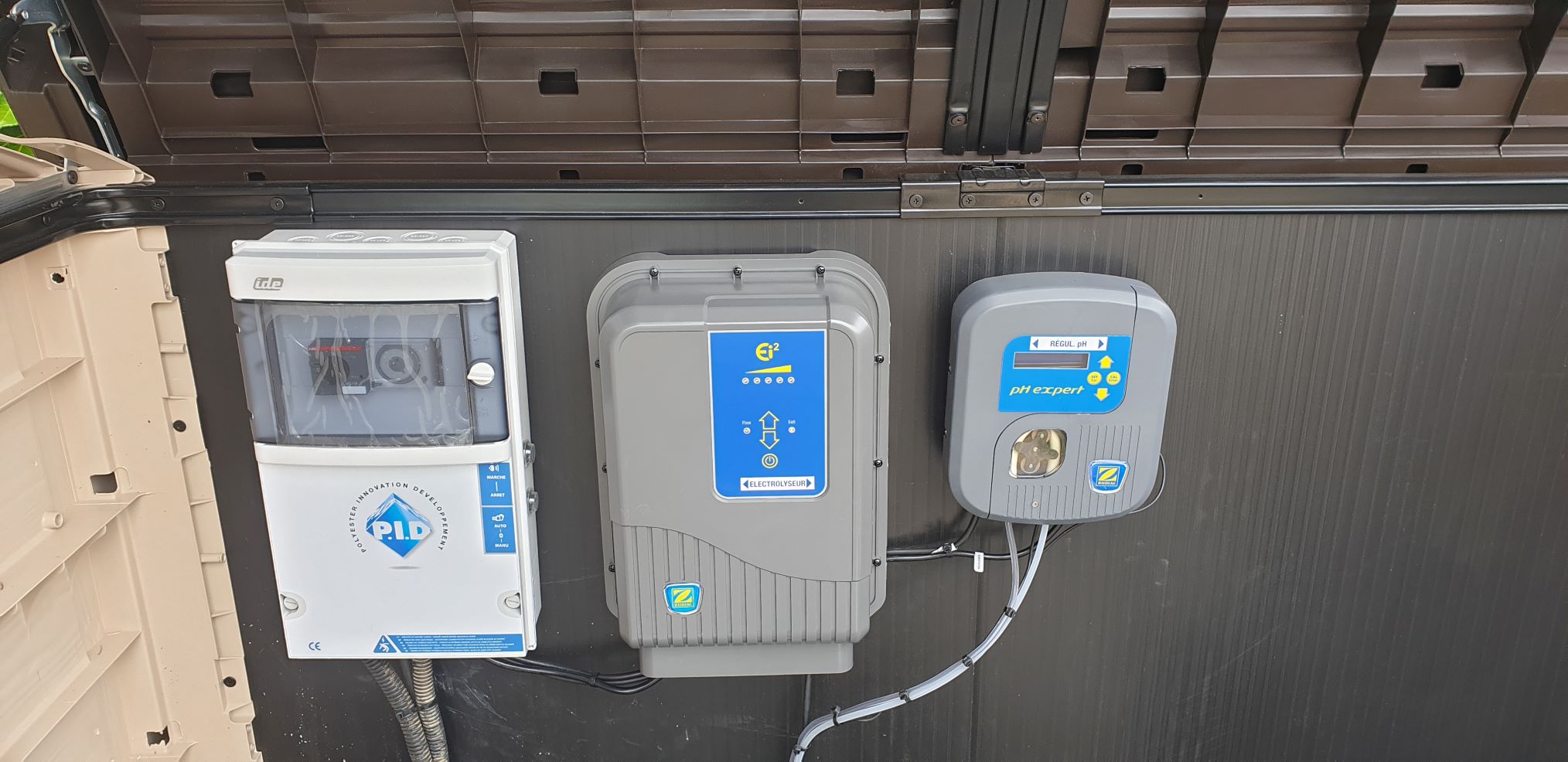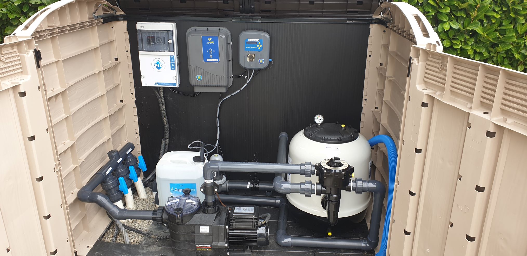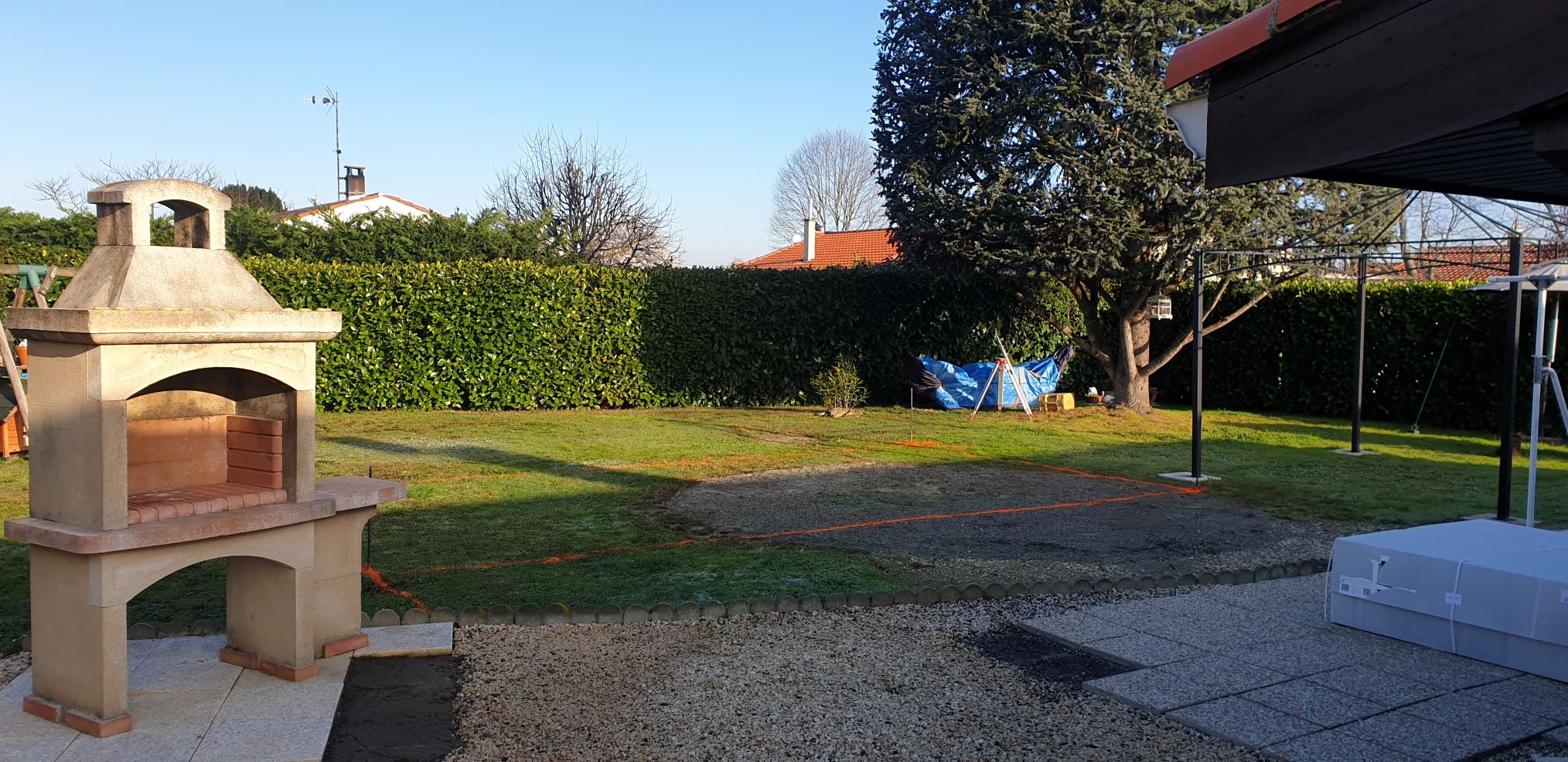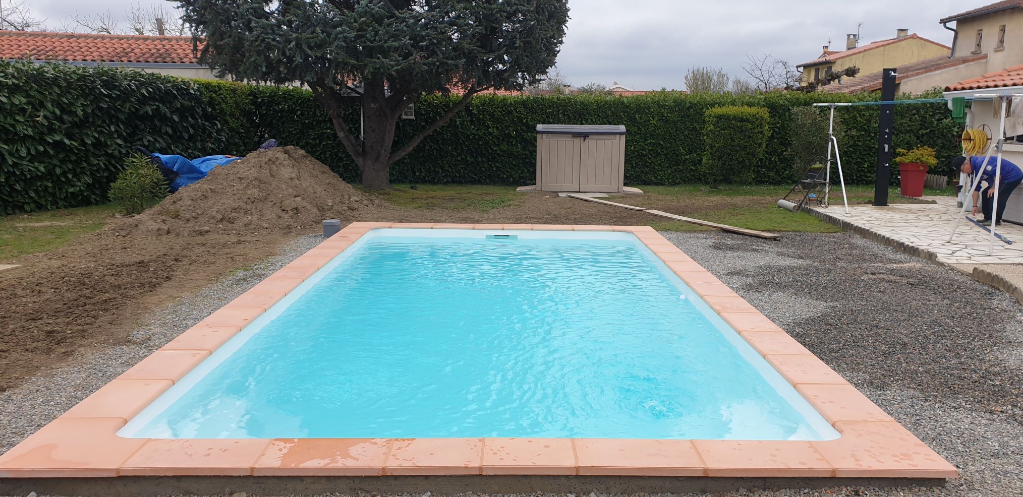 Et puis, nous avons raccordé l’ensemble du circuit hydraulique au bassin et monter les accessoires (skimmer, projecteur, etc.)